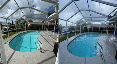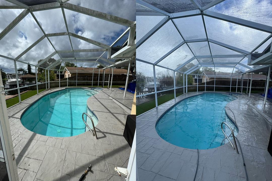 Is your pool area filthy?? ☀️ We at Blast Off Power Cleaning can help! She will make your pool screen enclosure and deck spotless.